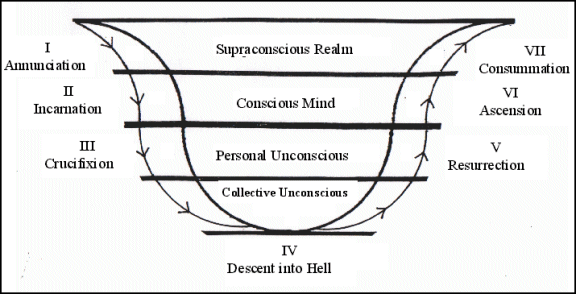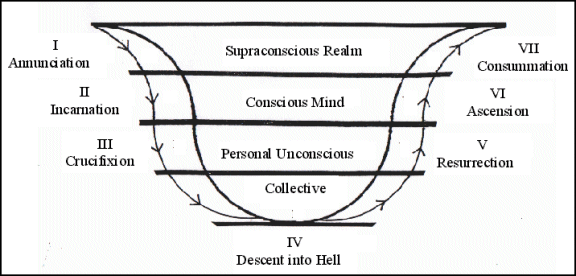 The Ancient Mysteries An ancient way of envisioning the soul’s journey was in progressive stages through descending and ascending levels of consciousness. The purpose of some of the world’s most ancient teachings was to guide neophytes safely through these stages. Until as recently as the twentieth century, knowledge of this process was considered sacred and limited to word-of-mouth transmission supported by geometric and diagrammatic constructs, with the journey itself requiring careful preparation and close supervision. As if hiding in plain view, the stages of the soul’s progression towards union with God is contained in the stepping-stone events of the life of Christ. This progression would inspire the magnum opus of the medieval philosopher-alchemists, whose work in turn would lead Jung to discover the parallel pattern of events in the individuation process of depth psychology. The quote at