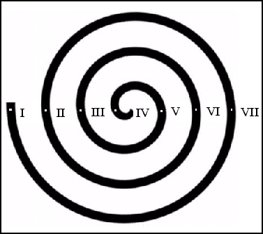 Symbolic Correspondences from East and West In the Eastern system of Kundalini Yoga there are also correspondences between lower and upper levels of consciousness. This system observes seven major centers of energy called “chakras.” When these are represented as dots and spirally connected, the resulting correspondences are between levels I and VII; II and VI; and III and V, and with IV as the turn-around or U-turn of the spiral. (Figure I-3) This is the same three-and-one-half turn spiral Campbell points to as a primary clue to the universality of the one truth undergirding the systematic symbolism of both East and West.