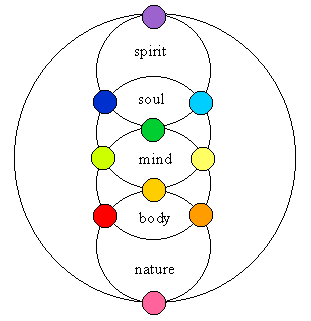 A fourth parallel to the life-of-Christ pattern is found in the Kabbalah Tree of Life. Sometimes this “Tree” is shown as four interpenetrating circles contained within a larger, all-embracing circle. The Tree is said to span four “worlds,” as shown in Figure I-5. The world of spirit overlaps the world of soul; the world of the soul the world of mind; and the world of mind the realm of nature and the physical body, thus forming five areas and seven levels.
