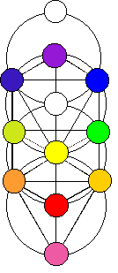 Insert Figure 5 The ten “lights” or Sefirot on the Tree of Life, as they appear in Figure 5, are strategically arranged throughout the four worlds, falling wherever worlds meet. In Figure 6 the Sefirot are shown in their traditional arrangement with their interconnecting pathways, but they are superimposed as well over the four worlds and include the Tree’s one “hidden light,” as well as an uppermost one for the unknowable, unfathomable Ensof.