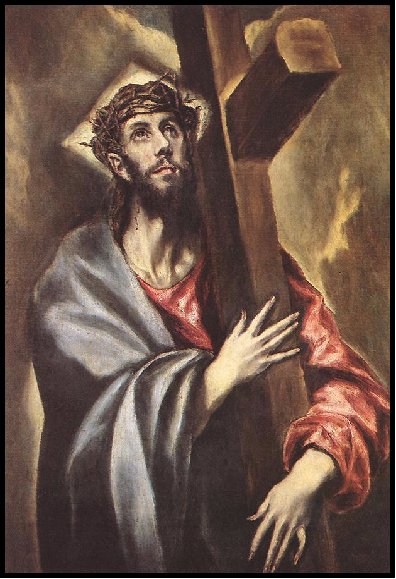 Embracing the Cross Even before Jesus came under the shadow of Crucifixion, he had made metaphoric use of carrying one’s own cross. Sanford has noted that in Jesus’ day “it was the custom for a person who was to be crucified to carry his own cross to the place of execution.” [C]arrying our own cross is a symbol for carrying our own psyche, hence for individuation. Individuation requires us to carry the burden of our personalities and our lives consciously and courageously.(8) Thus the gospel says: If anyone wishes to be a follower of mine, he must leave self behind; he must take up his cross and come with me.(9) But the ultimate meaning of Jesus’ words only becomes apparent on the road to Calvary. El Greco, in Plate IV-3, draws attention to the hands that are about to be disfigured on the cross. Leo Bronstein’s commentary points out that in bearing the Cross the hands of Jesus do not touch it. He would rename the painting “Christ Embracing the Cross."(10)