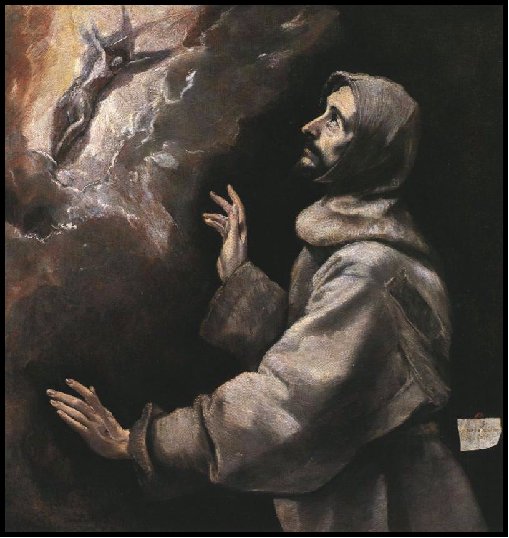 The Passion of Francis The crucifix for Francis was a touchstone to the event it encompassed. In vicariously suffering the passion of Christ, Francis’ life was empowered. On the San Damiano Crucifix time and eternity, heaven and earth came together: Heaven’s witnesses to the event were portrayed at the very top of the crucifix; with earth’s bystanders at the very foot; while angels observed from the left and right arms. Under one of Jesus’ outstretched arms his mother Mary and the beloved John were gathered in. Under the other arm, stood the two other Marys and the centurion who had acknowledged, “Truly this is the son of God.” But the engaging focal point of the icon was in the eyes of the Christ as he passively submitted to Crucifixion. The eyes of the icon became the portal through which Francis entered into a state of ecstatic receptivity to the plan of God for his life. Paradoxically, the Cross was also Francis’ source of joy. As Paul said that he “gloried” in the cross and carried “the marks of Jesus in his body,(13) so Francis’ soul was similarly so charged by the power of the Cross that near the end of his life he too manifested the marks of crucifixion in his own flesh. (Plate IV-6)