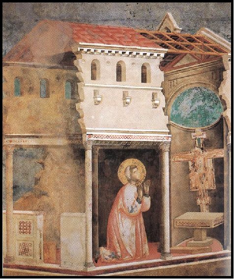 St Francis at San Damiano, by Giotto With his vision fixed upon the iconic eyes of Jesus, Francis heard the words, “Rebuild my Church.” Eventually he would understand the words as calling him to follow the Gospel as Jesus had lived and preached it. But in the meantime, he set about literally rebuilding the collapsing churches around Assisi. In his life the San Damiano Crucifix (Plate IV-5) served the highest function of a true symbol and charged his soul with a magnetism that drew others to join him in returning to the simplicity and purity of the teachings of the Gospels.