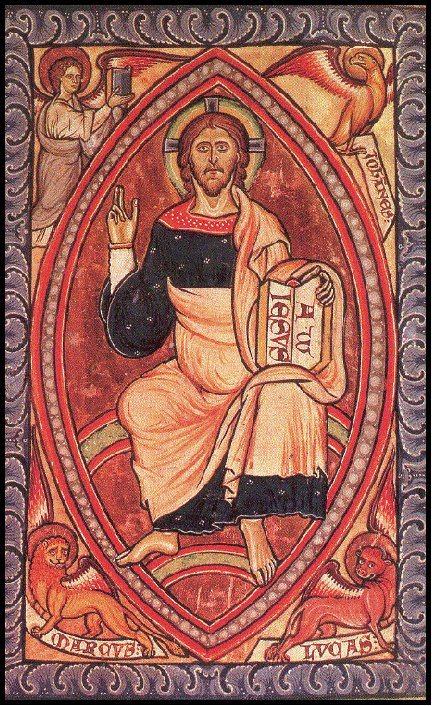 Here the majestic Christ, as the Alpha and Omega, is contained within the geometrically-derived vesica pisces. The symbolic representations of the four gospel/evangelists are in each corner. The illumination of this twelfth century manuscript is also a prime example of the astrological influences found in the Christian art of earlier centuries. Aside from the vesica--the fish-shaped intersection of two circles, and its relevance to Pisces—the traditional symbols for the four gospels, (directly derived from Ezekiel’s vision,) coincide with the motifs for the cardinal signs of the Old Testament Age of Aries: with the ox of Taurus assigned to Luke; the lion of Leo to Mark; the eagle, as Scorpio’s alternate motif, assigned to John; and Aquarius—the man, or son of man—to Matthew. To continue the correspondences, each of the four cardinal signs falls in a different season, and each sign is also assigned one of the four elements. Moreover, each of the elements relates to one of Jung’s four functions, and each function to a direction of the compass, and with the four functions forming a “compass of wholeness.”
