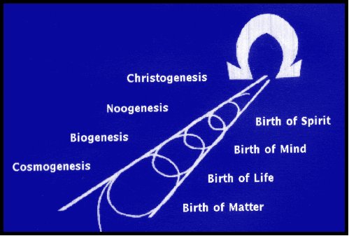 The Evolutionary Spiral According to Teilhard, humanity’s evolutionary path is an ascending spiral that is converging towards “Point Omega” as the Consummation or Christing of creation. He writes that “the Universe is centrated--Evolutively,” and goes on to explain that the movement of evolution is both upward and forward through space and time. (Figure VIII-1)