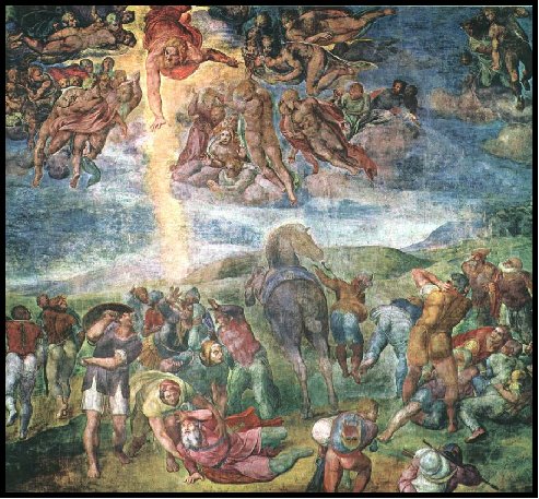 As the over-zealous persecutor of those he judged to be the over-zealous followers of false messiah, Paul was an unlikely choice for the task of turning a small Judaic sect into a world religion. His story is, in fact, hope for our times: that under certain circumstances God does meddle in human affairs in order to fulfill the divine design for creation. This precise moment Michelangelo captures portrays Paul as one slain by the Spirit and who, upon awakening, begins to fulfill his divine destiny to give shape to the message of God’s love incarnate in the person of Jesus, and in a form that insures it universal spread. The high drama of such an event is an indication of its impact on the collective. Michelangelo shows this with the twister-like beam of light that funnels down from the powerful arm of Christ (in the painting’s upper level), with an impact that knocks Paul off his horse and leaves him unconscious (at the bottom of the fresco). Through the artist’s creative genius the viewer is there as witness to the transdimensional impact of the mind of Christ on the mind of Paul. By the proximity of the foreground, Michelangelo draws us into the scene. We are also there because what is happening to Paul is of such import that it is happening collectively to all and for all times. What were the circumstances that led to Paul’s encounter with the living Christ? When was the wedge driven into his pharisaic mind? Some say it was at the stoning of Stephen when “the witnesses laid down their garments at Saul’s feet."( 9) Or perhaps Paul’s conversion was God’s answer to Stephen’s dying prayer, “Lord, do not hold this sin against them."(10) The circumstances surrounding the conversion suggest several questions for personal reflection: Where and under what circumstances did my cosmic egg begin to crack? When has the light of a higher, spiritual awareness broken through into my ordinary conscious mind? One thing was