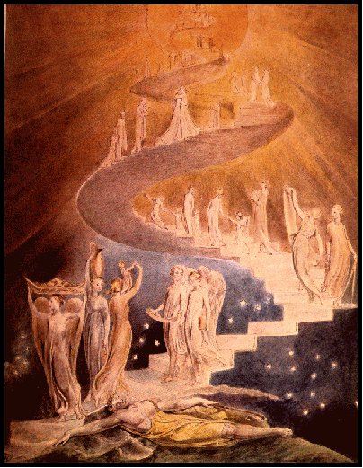 The Myriad Rungs of Consciousness With quantum physics advising that energy and light, in varying wave lengths, move through space spirally, the “worlds” of the scientist and the mystic are convering. And with the more recent focus of physics on the inner space of microcosmic, subatomic, non-tangible reality, science and religion as allies stand poised for the next great leap in the evolution of consciousness. Blake’s spirit-driven imagination envisioned Jacob’s ladder as a spiral stairway spanning heaven and earth, and on which angels were descending and ascending. (Plate VIII-2) The painting moves the eye around four predominant, upwardly-spiraling turns, creating a visual correspondence to Teilhard’s evolutionary spiral.