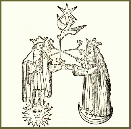 In the woodcut, the king is standing on the sun, symbolic of the masculine principle, and the queen on the moon, symbolic of the feminine principle. Their left hands are touching to signify contact with the unconscious archetypes each represents. Union on this level of the archetypes and instincts is fundamental to the process. In their right hands each holds out to the other a leafing branch, symbolic of the growth in consciousness which will be the ongoing interchange between them. The crossing of the right-hand-held branches establishes the diagram’s overall flow of energy as a circulation between the masculine and feminine poles of the psyche the two figures represent. The circulation is in the rhythmically-balanced interchange of a figure eight which, as a double quaternity symbol, signifies wholeness in both poles. In the image as a whole, the six-pointed star in the highest position points to the process’ projected completion as the same conjunction of opposites visualized earlier in the two-dimensional Star-of-David, and three-dimensionally as the star tetrahedron. The emphasis of the alchemical star, however, is on its three axes, symbolic of the three-fold union represented. In the diagram, the lines of the axes are repeated in the three branches, their resting or grounding points on the joined left hands to confirm the archetypal unconscious as where the mystery of the conjunction--the inner marriage--is taking place. It is on this deepest, collective, psychoid level of nature that the duality inherent to human nature, in its triune mind/body/spirit expression finds resolution and the final reconciliation of spirit, mind and body. As a three-fold process, the horizontally-crossed axes speak of the work of the first two stages—illumination and purgation--known to the Alchemists as the “lesser conjunction.” But it is the bird, vertical axis that points to the grand conjunction--the culminating union of the divine and the human. The animating spirit of the process is represented by the dove from whose beak the branch of peace is extended. But this dove is not the third person of the all-masculine Trinity. Rather it reverts to an earlier symbolism still prevalent in the Eastern Church, where the dove is identified with Holy Wisdom--with Sophia—and the Old Testament theme of the love of wisdom. Nor can this amazing sixteenth century correspondence to the mystical union be left without noting one further significance: the star’s three axes as formed by an “I”—for the Greek Iesus--and an “X”--for the “Ch” of Christus—the earliest and most widely used monogram for Jesus the Christ.