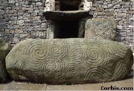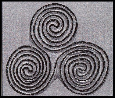 Figure E-5 The motif of Figure E-5 is a replica of the triple spiral found in the main chamber of the megalithic tomb-sanctuary at Newgrange, Ireland. It is dated around 3000 BC, and part of the Stone Age Irish “grave-passage” culture. A similar triple spiral also appears on the Newgrange entrance stone.