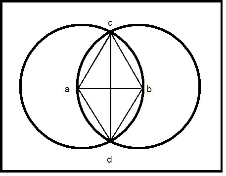 Some early Christian symbolists, who may have been Pythagorean geometricians as well, saw the vesica as the womb of the equilateral triangle and therefore symbolic of the Holy Trinity. The Trinity, and the number three as its numeric equivalent, is another way of understanding how duality is reconciled. Figure E-4 details how a perfect triangle is derived by connecting points “a” and “b”--the centers of the two circles—and then points “a” and “b” to “c.” When “a” and “b” are also connected to “d,” the result is a perfect diamond.