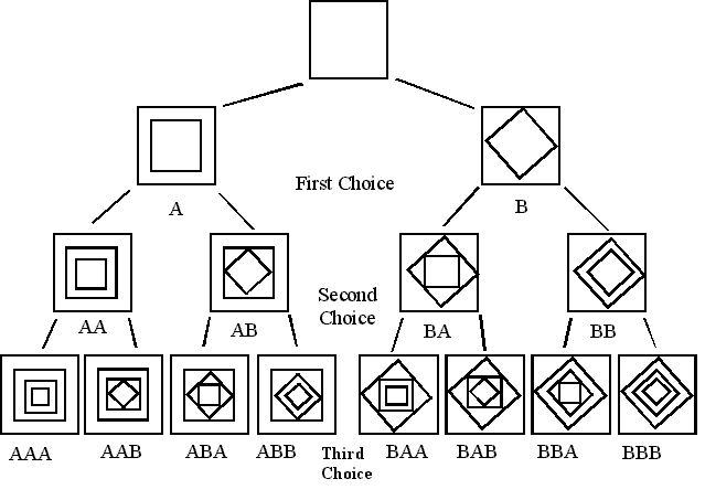 Above the three choices between "A" (Yin--passive) or "B" (Yang--active) are diagrammed to show how progressively they lead to the eight possible arrangements. In this way, the three innermost squares yield the eight design possibilities in arrangements that range from the most static (AAA), and therefore most restful design, to the most dynamic (BBB), or most energized arrangement: From this and the advancing or receding characteristics of the seven colors incorporated into a mandala it is possible to discern a great deal about the process of change and movement in our own lives or in the lives of those with whom we may be engaged in counseling or art therapy. Sometimes persons who appear to be extroverts will say they think of themselves as introverts. To go beyond labels, a mandala made today will be a reliable reflection of the direction one's energy is wanting or needing to go for the sake of the overall balance of the psyche. But over a period of time there may also be a consistency to a person's tendency or preference for one end or other of the spectrum and for arrangements that are tend to be balanced (ABA and BAB) or fall at one extreme or the other (AAA or BBB) or somewhere in between (AAB / ABB or BAA / BBA). To the