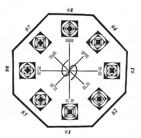 The principle of synchronicity upon which Jung found the I Ching to be based is a choice-making process. So is the Infinite Possibilities Mandala Maker. It is therefore not surprising that this particular method of making mandalas comes also bearing inner wisdom from which it is possible to discern guidance and counsel. And one of its messages is that our choices are greater than we might have believed, and also far less to be feared than we may have imagined. Life's crisis are often intersections where there seem to be no or limited choices, or sometimes situations in which we fear making wrong choices. Then, or in preparation for such times, making mandalas is an exercise in daring to choose, and then choose again and again. For each mandala made according to the IPMM method ten choices are required--seven involving color and three concerning arrangement. Traditionally mandalas have been created for "focusing" and "centering" in meditation. When used in conjunction with a Mandala Journal this method facilitates a flow between the symbolic or visual and the logical or verbal levels of consciousness. Just how one taps into wellsprings of creativity is suggested in "There is No Sound in an Empty Room," (Joan Richardson, Co-Evolution Quarterly #55) wherein the author notes the old Chinese belief that the ideal number of poems in an anthology to be around 300. It was thought that by thoroughly coming to know that number of poems persons would themselves know how to compose a poem. Similar rewards are to be gained from diligently spending time in creating mandalas, and over a sufficiently long period of time. If this method is undertaken as a daily discipline or approach to inner work, and if as part of this the mandalas and the process of making them are interacted with through journaling, you will experientially come to know more about color, more about symbol, and about balance and choice-making than ever you could have imagined. If you are familiar with the I Ching, the ancient Chinese "Book of Changes," or for that matter computer mathematics, you already know that with two "this or that" choices and three variables involving the two choices, the arrangement possibilities number eight. In the I Ching the two choices are for "Yin" ( _ _ ), the earth principal, and for "Yang" ( ___ ), the heaven principle. These two, when formed into three-line trigrams, yield the eight possible arrangements as show in the illustration at the top of this page. In creating a mandala according to this method, the dynamics are determined when each of the three inner squares are placed either squarely or diagonally. It is important that this be done with as much spontaneity as possible. In this way the total impact of a design becomes either more or less passive or active. As for the fourth or largest square, it serves as the unmovable foundation upon which the mandala is built, while the three circles always remain in their same relationship to the squares and to each other. When this symbolism of levels and colors is related to the levels or dimensions of consciousness the implication is of an interfacing or interpenetration of the influences of spirit (heaven) and matter (earth). In any truly creative endeavor in which we are open to the influences of "heaven" we feel inspired--in-spirited and energized. |