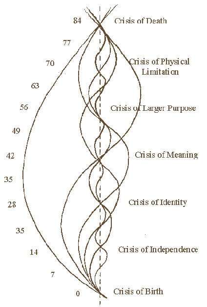 When the full life cycle is divided according to a ratio of 1:6, the pattern reveals seven crises or initiations that occur every 14 or so years. These transitional crises are the means by which a person is initiated into the next stage of life: