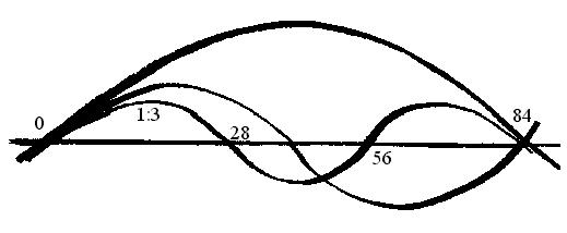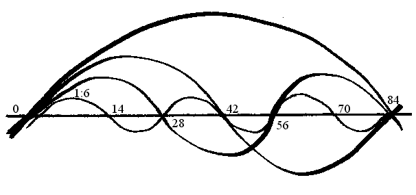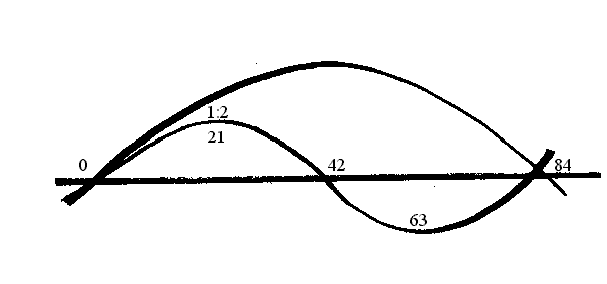 When Uranus' 84-year cycle is divided in two, the mid-life point falls at 42. When life's mid-point is reached the energies Uranus embodies become disruptive of whatever status quo a person, out of fear of change, may have settled into. As can be read in the cycle's downward descending line (Figure 2), the passage is from the above-the-line curve of feeling in conscious control of life to experiencing unconscious pulls from unfamiliar or fear-laden territories. A quarter or ratio 1:4 cycle is a sub-harmony of Uranus' disruptive energies and is considered relevant to mental activity. The energy symbolized is sometimes associated with earthquakes and is substantiated by dreams in which to the ground on which one is standing is being shaken. In other words, an earthquake dream may portend the shakeup of one's ingrained or underlying attitudes, or one's unexamined assumptions--the solid ground on which one has been standing. Aside from the proverbial mid-life crisis, other times that call for a re-examination of values may come around ages 21 and 63, and mark the high and the low points of the mental characteristics of this cycle. At 21 the vantage point is from a high, wide-open perspective of life's many possibilities; but by 63 the mind is contemplating the advantages of narrowing its vista in order to experience what has been missing or out of balance in one's life. The ancient Hebrews had an interesting astrological perspective based on the 20-year conjunctions of the planets Saturn and Jupiter. Rabbi Joel Dobin (Astrological Secrets of the Hebrew Sages, Inner Traditions, NY, 1977, p 33) explains that since Saturn was such a slow moving planet and the farthest visible, it was considered to be the Divine Messenger: