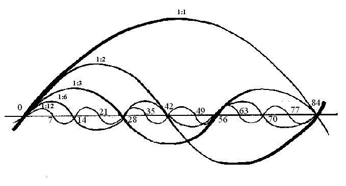 Life, according to the harmonies of 7 and 12, progresses cyclically and spirally. It moves both forward and upward through the seven above described crises or initiations. As can be seen in Figure 5 above, at 42 sub-cycles 1:2, 1:3 and 1:6, all converge. Another visually informing coincidence of lines is at 56. Here the same three feeling-related sub-harmonies all appear to be emerging from their troughs to ascend from below to above the line in unison. This trough to crest ascent in consciousness often, but not always, coincides with ages 52 to 59. If and when it is successfully completed it leads to a new, transpersonal perspective on life--that of the Self. Psychologically understood, it is the ego's displacement by the Self as the new center of the total person. It is also the passage classical mysticism describes as the dark night of the soul. But its fruit is the rebirth of spiritual vision by which one sees the larger purpose of life and by which a person is re-energized to serve Life. Jung, in emerging from his death-of-self-will crisis, ever after understood his life as no longer belonging to himself but to the whole of life. |
