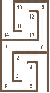 physical maturity at around fourteen years. In terms of astrology's "houses," the first journey into the labyrinth is through the first two of twelve houses. As can be seen in Figure 4, the first turn into the labyrinth is onto the third circuit. Immediately (turn 1) one is brought in touch with the cross by which the four directions are marked. Initially, the path moves clockwise out and around, negotiating a hairpin turn (2 and 3) onto level two. Here the direction is reversed to counterclockwise as the level two path makes a second hairpin turn (4 and 5) onto level one, and again changes direction to clockwise and leads back the cross (turn 7). Thus the circuit through the three outer circles--corresponding to life's first house--is complete.