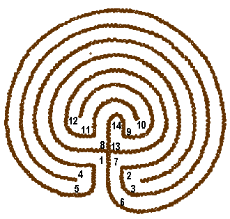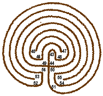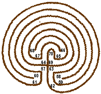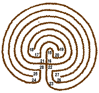 First In and Out Journey In the first in and out spiral through the labyrinth, the first seven turns correspond to ages 1 to 7 or life's first "house." Note how these years move recursively through the labyrinth's outer rings and by which the formative phase of the cycle is established. With the seventh turn, the fourth or pivotal circle is entered, four always being pivotal in a symbolism based on seven. In moving into the fourth ring, the second house of ages 8 to 14 is entered. The movement is now through the inner rings and towards the cycle's fullness at the center--the 14th turn. The journey out, then, is through the third house or phase of the cycle and corresponds to ages 15 through 21. Again the movement is within the inner rings--these being most closely connected to the fulfillment phases of the cycle. Finally, in the fourth phase, which will bring the cycle to completion, the movement is back out into and through the outer circles--corresponding to ages 22 through 28--the final waning with which the first cycle ends and from which the second will be born.. |