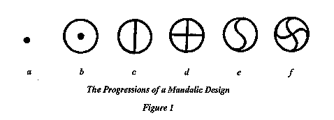 By design a mandala is enclosed, selected and ordered. In a mandala everything is subject to its center and all the parts are in a balanced and complementary relationship to each other. Additionally, all are encircled and included within the circumference of the design as a whole. The progressions of a mandalic design are illustrated in Figure 1: first the point of origin (a) around which the circle is defined (b); then its division into two (c), and then into four (d). The familiar yin/yang symbol (e) is another way a circle can be divided equally in two, and when this again is divided in two (f) the final progression illustrates the dynamic, outwardly expanding movement of the "four rivers" by which the whole of the territory of Eden was made "fertile."