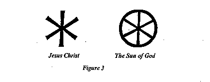The Heaven-Earth Axis If four rivers, depicted as two crossing axes, divide Eden's horizontal plane, its vertical dimension, the Heaven/Earth connection, is defined by a third axis. In drawing a circle the circumference is scribed around its center, but symbolically considered a circle is a flat representation of a sphere, and in order to represent a sphere the central axis around which it rotates must somehow be inferred. The graphic motif that most simply expresses three axes is shown in Figure 3: The "X" represents earth divided by two horizontal axes; the "I" stands for the vertical axis by which heaven and earth are spanned. These same three axes encompassed by a circle form the ancient "sun wheel," a motif adopted by gnosticism to mean Jesu (I) Christo (X) the sun (O) of God."