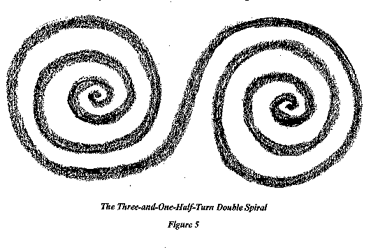Also concerning the double spiral, Cirlot suggests these are the "flattened projection of the two halves of the egg of the world,"(14)Today we tend to look upon these designs which date back to Megalithic times as "primitive art." But it is more likely that to those who chiseled them in stone their art was also their religion. And as religious symbols they evoked in peoples of the past a feeling of being in relationship with the cosmos. As an experiment, using your finger tip, trace the outline of Figure 5, moving back and forth from the center of one spiral to the center of the other, and from the other back to the one, repeating the movement until you sense its centering, balancing, calming effect. Next, with eyes still on the motif and using both hands and arms, trace its outline in the air.