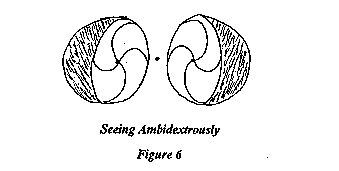 To see paradoxically is to see the opposing sides as the parts of a whole: now this, now that; holding one view in the left-hand and the other in the right-hand; then bringing the two together as the left and the right of the whole. To be able to take hold, however lightly, of two seemingly opposing points of view opens us to what Nahum Stiskin, in his book The Looking-Glass God, describes as a way of seeing the two faces--the front and the back--of the one ultimate reality.(17)Stiskin refers his readers to another book, The Ambidextrous Universe,(18)which concept is illustrated in Figure 6. Using the four rivers of Eden as an image, imagine a sphere divided at its equator and as having an exact center that is shared by both left and right hemispheres. Then imagine the four rivers flowing out from this shared center into both hemispheres so as to appear in mirror-opposite relationship. The rivers to the left flow clockwise; and those to the right flow counterclockwise--the two in seemingly opposite directions. But if the two hemispheres are next imagined to fold back into the one sphere from which they were originally divided, then their oppositeness--their ambidexterity--disappears. Multiplicity is swallowed up in unity. The divided is reunited.