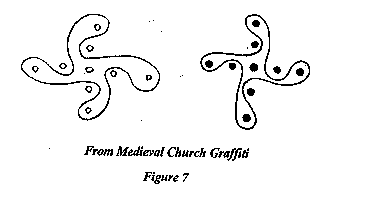All Is Well When, due to something we have done or left undone, we are left with a sense of separation either from God or others, we experience a sense of loss. But when we turn from moving away to moving back into relationship, then joy returns: "the rivers clap their hands, and . . . the hills ring out."(19)Moreover, there is something about an act of reconciliation that enables us to move beyond where we previously were. Through an act of self-will we fell away, maybe even necessarily so, but in returning we find that our consciousness has leaped over former obstacles. For a number of years I was estranged from the Church. Then, after my mother's death, I began longing for "Mother Church" into whose arms I had been born and whose memories for me were happy. One day I heard an inner voice speak resolutely. "I'm going back," it said. And when I did I experienced a sense of well-being, a welling up of joy. Before leaving the Church I had come to see it as full of faults and imperfections. In the intervening years I had done some "shadow work" of my own so that on returning I found myself more at peace with imperfection, both in myself and others. The most essential meaning of the familiar four-armed whirling cross, the same motif as Eden's rivers, is "All is well" . According to Pennick this ancient and universal design symbolizes "the rotation of the heavens about the central axis of the world," an orderedness that communicates "God is in his heavens, all is well in the world."(20)So it is with ourselves when we feel contained within the all-embracing arms of God and know ourselves to be part of his all-encompassing universe. For some the symbols and rituals of the Church have lost their meaning, but for others the Church still can be a nurturing connection to the maternal heart of God. In offering unconditional love the Church fulfills her feminine role. For others the Church is a connection to a loving father and offers the stability of tradition and an opportunity to grow through serving others. For the soul to have a sense of well-being both kinds of love--that of a mother's and that of a father's--are necessary. The "all is well" whirling crosses in Figure 7 are from church graffiti of English medieval origin. They are similar to the Hopi "Kachina" symbolism in which the arms sometimes are shown moving clockwise and sometimes counterclockwise, the former "showing affinity" with the sun, the masculine, and the latter with the earth, the feminine.