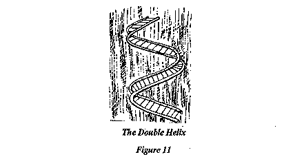 The Double Helix Having fallen into lateral, sequentially perceived time we make our way back to eternity spirally. In ascending the spiral stairway of life each new level is at right angles to the one below. Each shift in consciousness demands an alternation of perspective and a reorientation towards life. Just as the seed determines the unfolding of the tree, so within each human life a similar blueprint is contained in the double spiraling DNA molecule. (Figure 11) About the double helix Doczi observes that