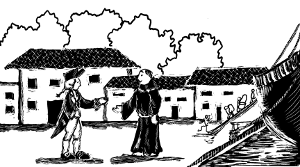 For the next portion of the journey Juan and Old Father were to accompany Fages to San Diego. There the commandant was to meet the mule train and arrange for supplies to be taken to the northern missions. Serra and Juan would then board the San Carlos and sail to a port in Mexico. From there they would walk over land to Mexico City. But there were problems. First the San Antonio, carrying supplies long awaited and vital to the missions had been forced to turn back because of severe winds. Without these supplies the missions would face starvation long before the mule train arrived. It was therefore up to Serra to convince the ship's captain to make another attempt. Once this was settled a quarrel between Fages and the captain of the San Carlos caused further delay. But finally Juan's dream of sailing on the sea in a big ship came true. He was on his way to a new world, "one no Achastan had ever before seen."