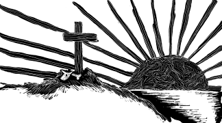 The winter months over, they returned to their coastal home to find the strangers were gone, but, on a hill overlooking the big water, had left behind "the sacred sign of their god."